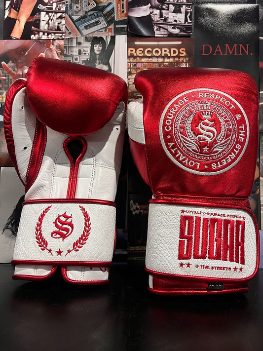 Metallic Red and White Snakeskin 12Oz Velcro Boxing Gloves