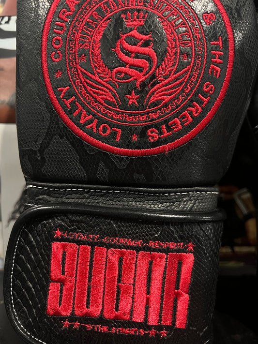 Black Snakeskin and Fire Red 12Oz Velcro Boxing Gloves