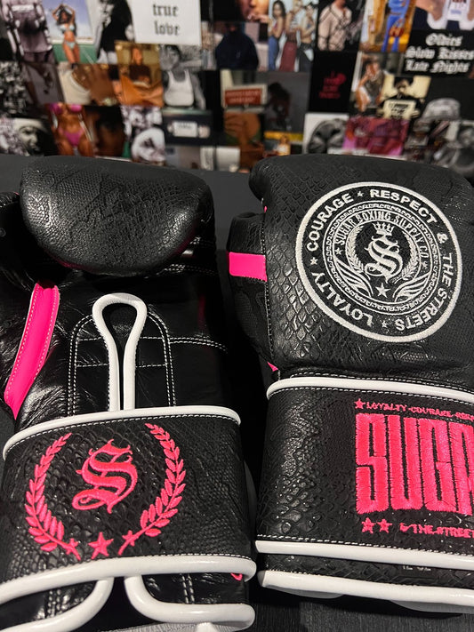 Black Snakeskin Magenta and White 12Oz Velcro Boxing Gloves