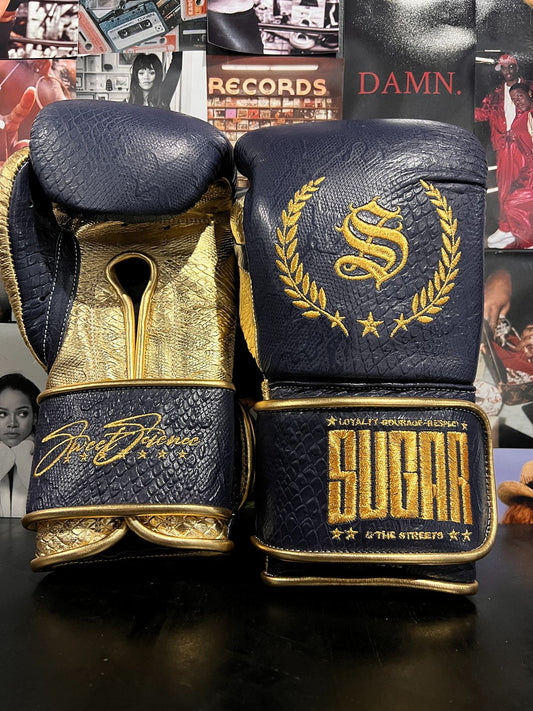 Metallic Gold and Navy Blue Snakeskin 12Oz Velcro Boxing Gloves